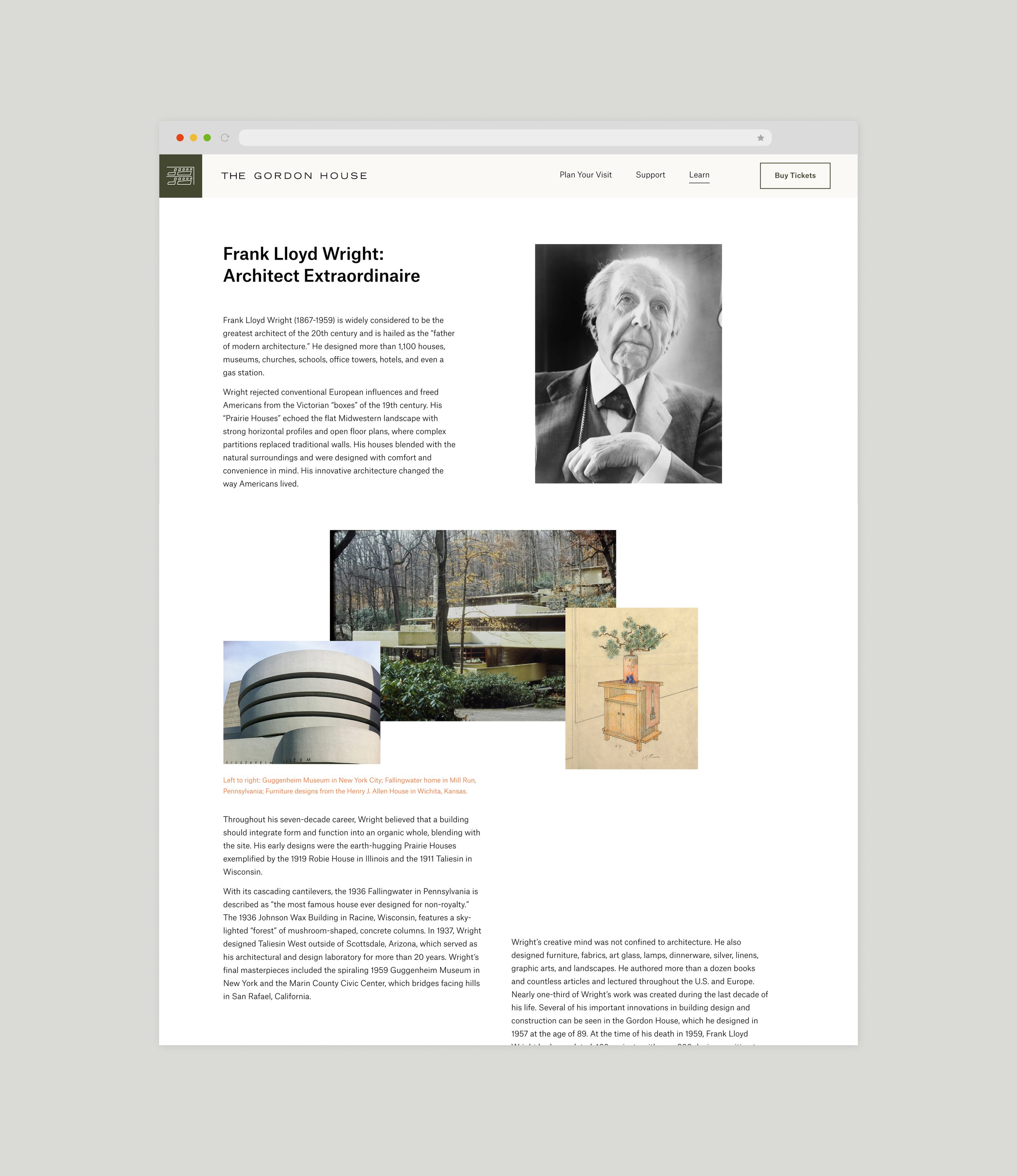 Part of the task of the website redesign was to create new educational pages that shared the history of the house and Frank Lloyd Wright’s place in architectural history.